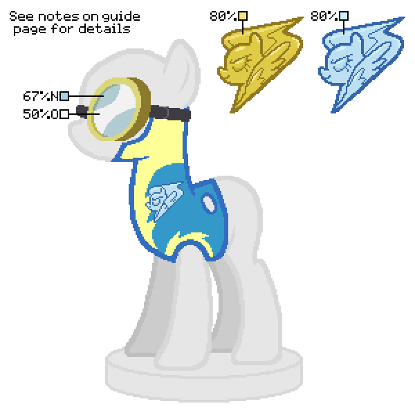 Last major changeBased on S3E7 The uppermost highlight on the Lead pony and Wingpony badges uses a different color and opacity than the rest. The lenses of the goggles are comprised of two objects that do not overlap. The fill uses 67% normal blending and the highlight uses 50% overlay blending as far as we can tell.